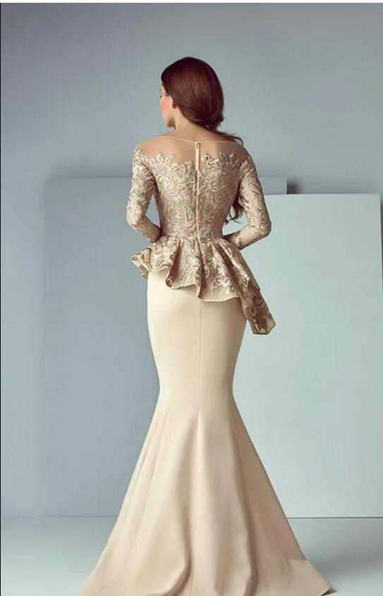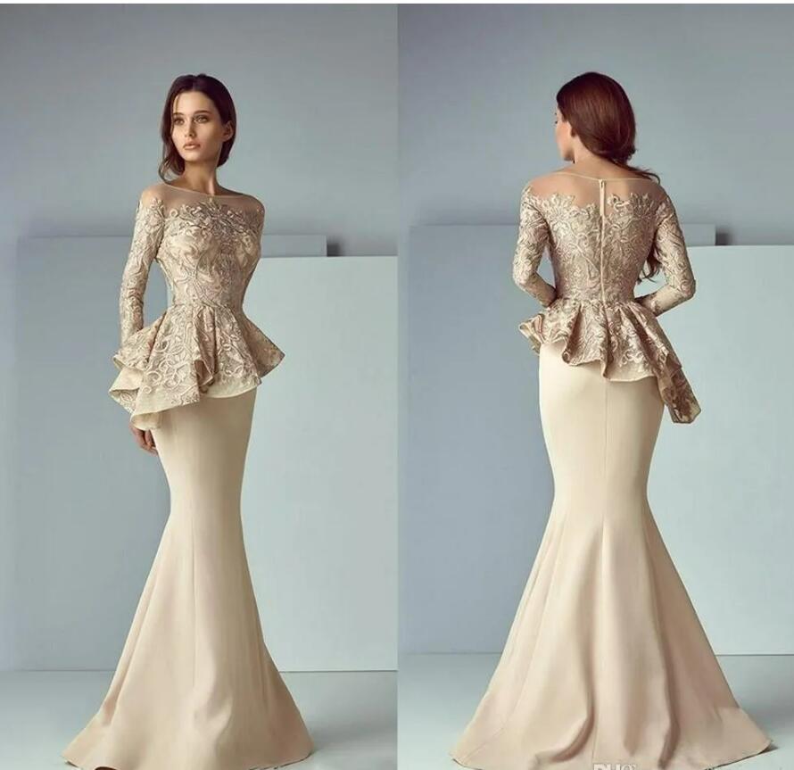 Dubai Arabic Champagne Lace Stain Peplum Mermaid Mother of the Bride/Groom Dresses Long Sheer Neck Long Sleeve Elegant Evening Formal Gowns
