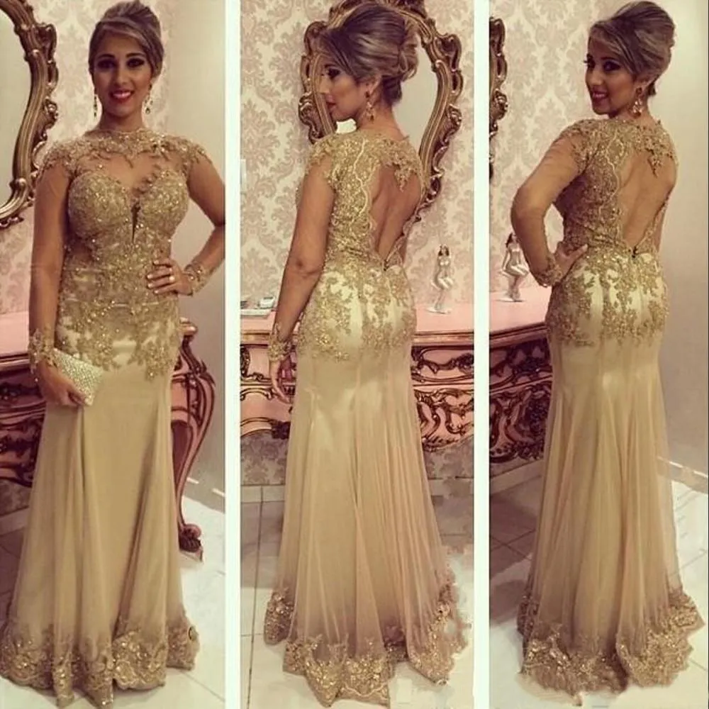 Sexy Champagne Gold Mother of the Bride/Groom Dresses Lace Appliques Beads Long Sleeves Hollow Back Floor Length