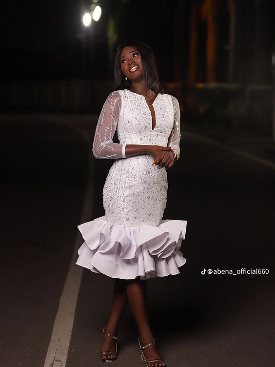 Simple Beading Crystals 3/4 Long Sleeve Tea-length African Wedding Dress Bridal Dress