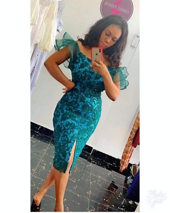 Dark Green and Blue Lace Sheath Tea-length African Prom Dress Evening Dress