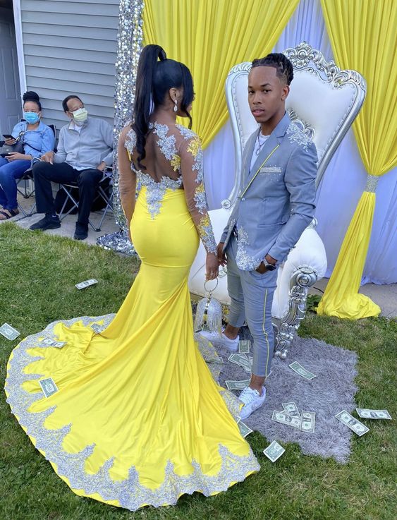 Yellow Mermaid Crew Neck Lace Appliques Afrcian Prom Dress Evening Dress