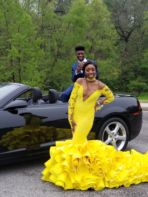 Yellow Mermaid Lace Appliques Tiered Afrcian Prom Dress Evening Dress
