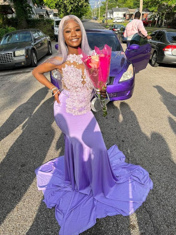 Purple Mermaid Lace Appliques African Prom Dress Evening Dress