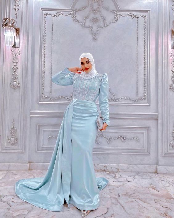 Baby Blue Mermaid Beading Long Sleeve Muslim Prom Dress Evening Dress