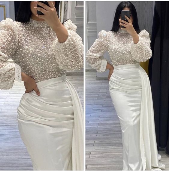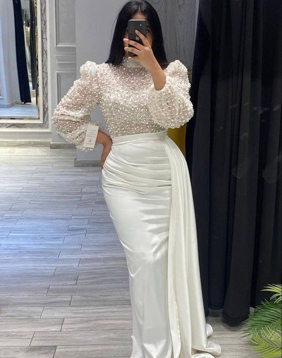White Mermaid Perals Muslim Prom Dress Evening Dress