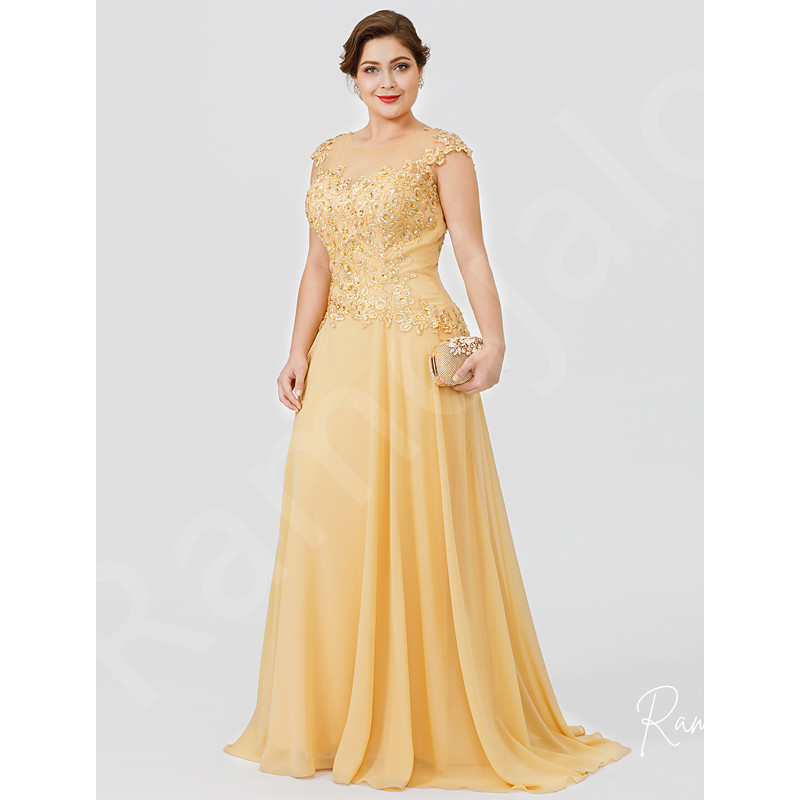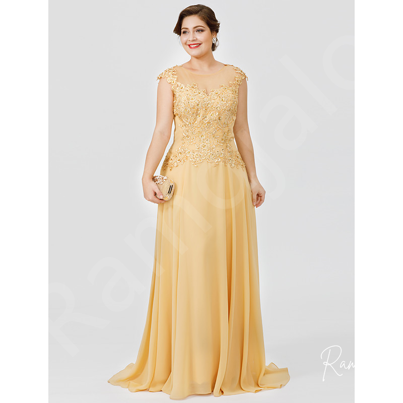 Long Mother Of The Bride Groom Dresses for Wedding Gold Chiffon Plus Size Lace Appliques Cap Short Sleeves Sheer Invitada Guest