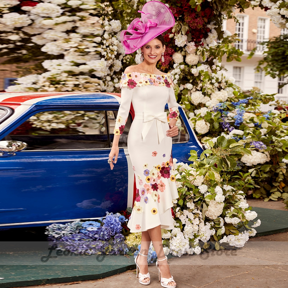 Mermaid Sheath Mother Of The Bride Dresses 3/4 Sleeve O Neck Off Shoulder Wedding Party Dress Flowers Tea-Length