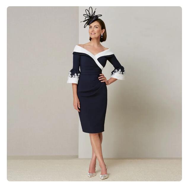 Elegant Mother Of The Bride Dresses For Wedding Off Shoulder Applique Trumpet Sleeves Knee Length Short Groom Mom Formal Gown