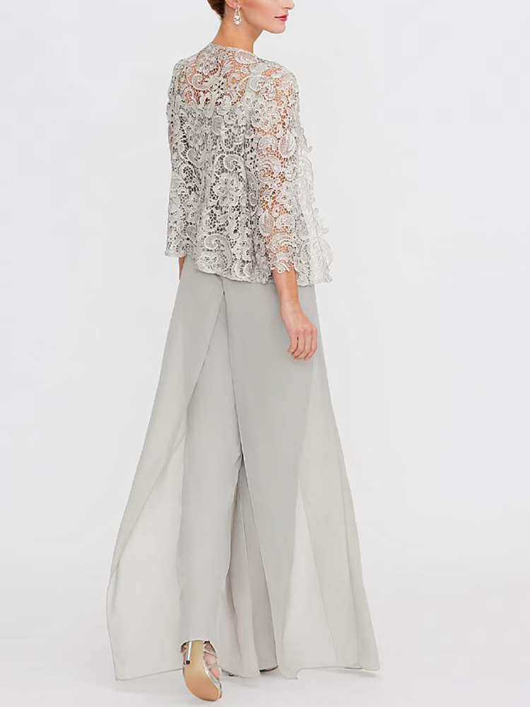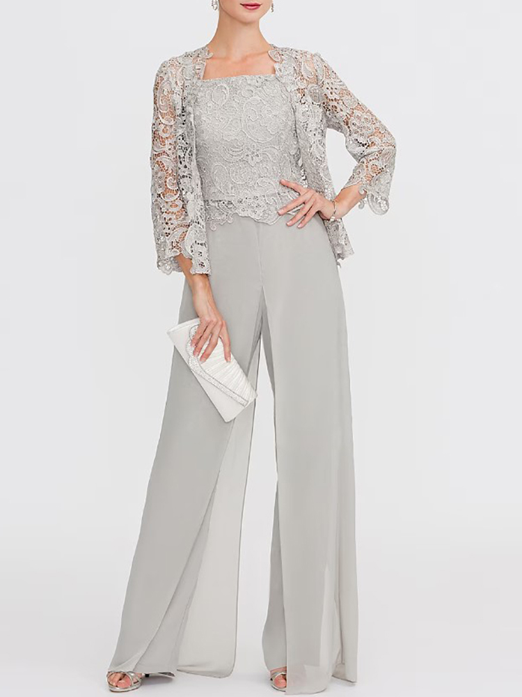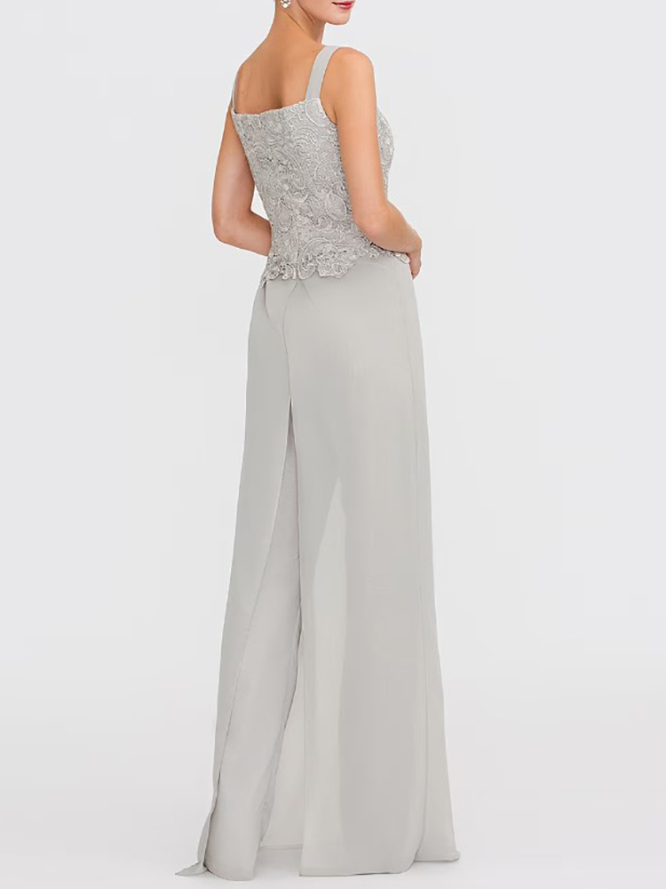 Pantsuit Mother of the Bride Dress Chiffon Lace Appliques Square Neck Floor-Length Formal Elegant Wedding Party Guest