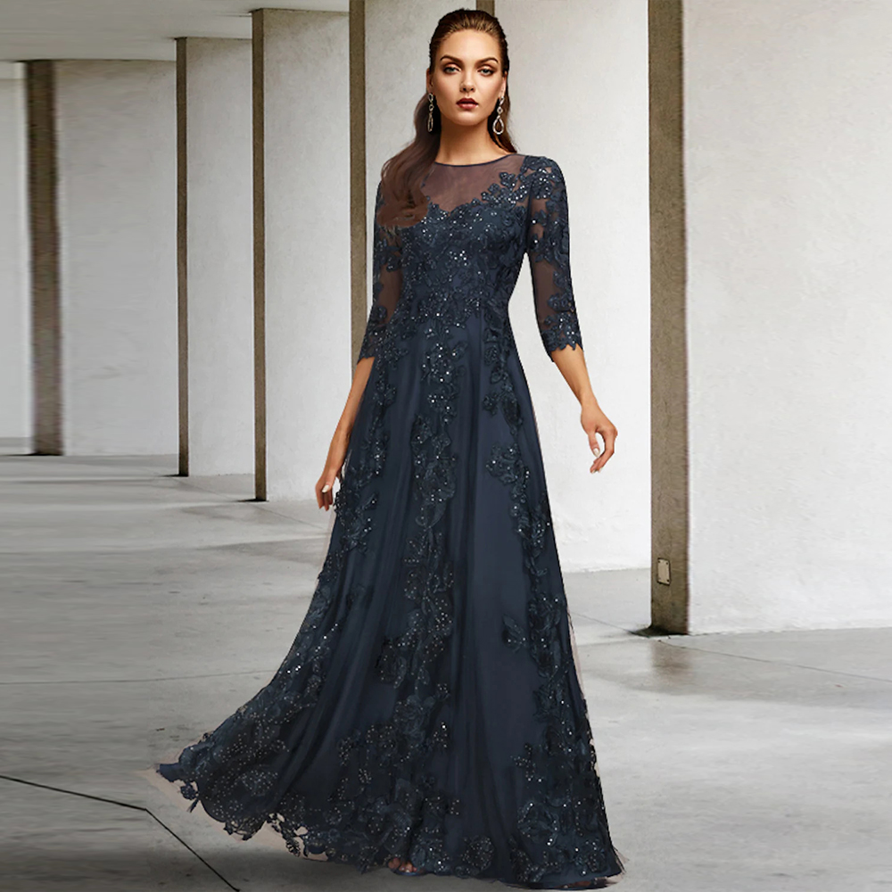 Glitter Navy Mother of the Bride/Groom Dresses O Neck 3/4 Sleeves Wedding Party Gowns Appliques Sequined A-Line Robe De Soirée Femme