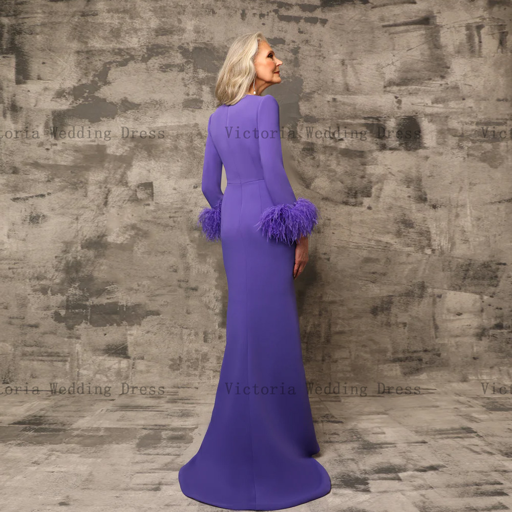 Lavender Mermaid Mother of the Bride/Groom Dresses O Neck Long Sleeves Wedding Party Gowns Feathers Buttons Floor-Lengt