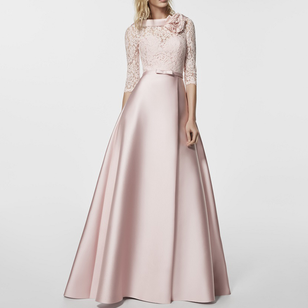 Pink Lace Mother Of The Bride/Groom Dresses High Collar Neck 3/4 Sleeves Flower Wedding Party Gowns A-line Floor-Length Bow Satin