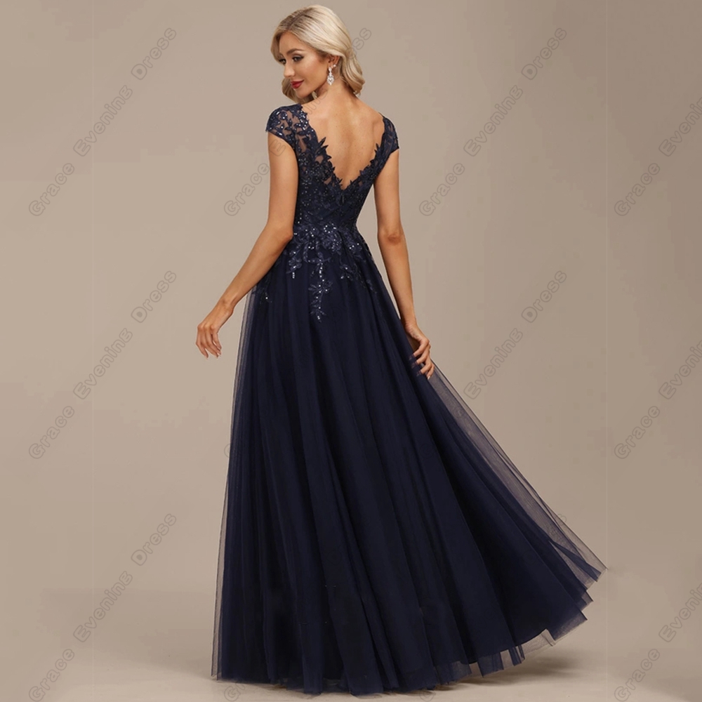 Dark Navy Strapless Mother of Bride/Groom Dresses for Women Cap Sleeve Wedding Party Gown with Lace Soft Tulle Sparkle Vestido De