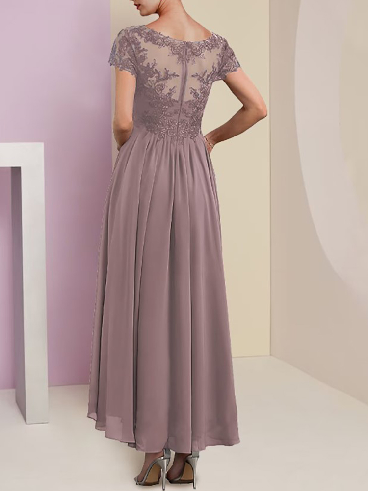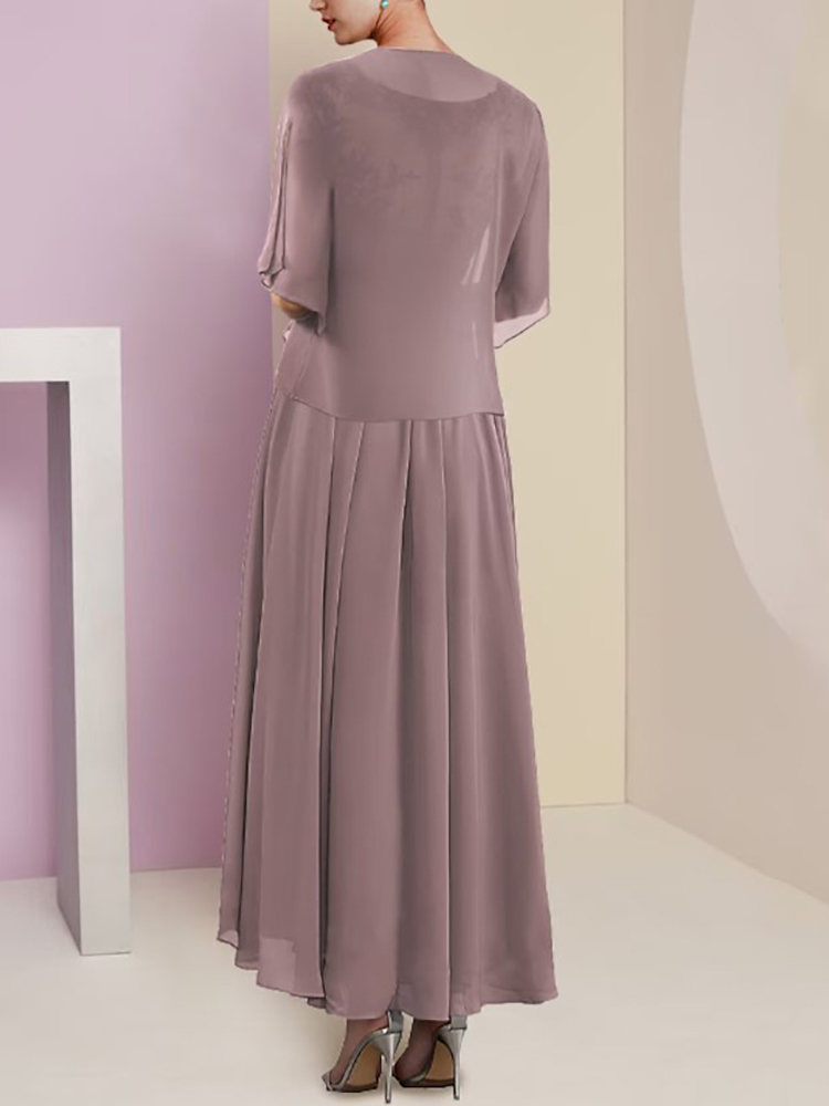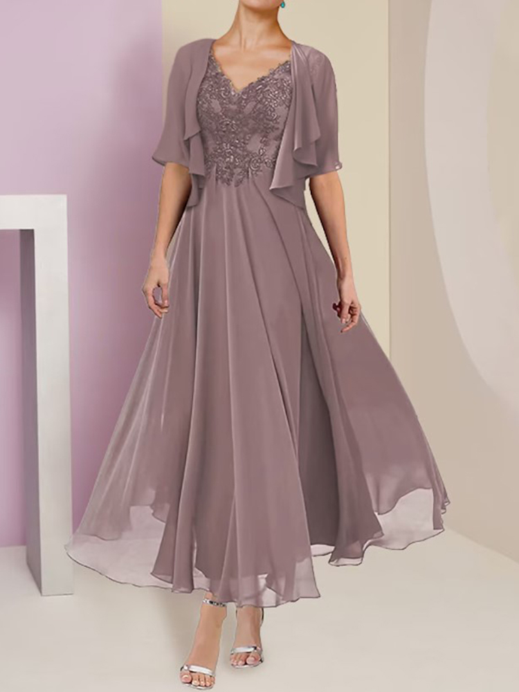 Elegant Chiffon Two Piece Mother Of The Bride/Groom Dresses A Line Lace Appliques V Neck Short Sleeves Ankle Length Wedding Guest Gown