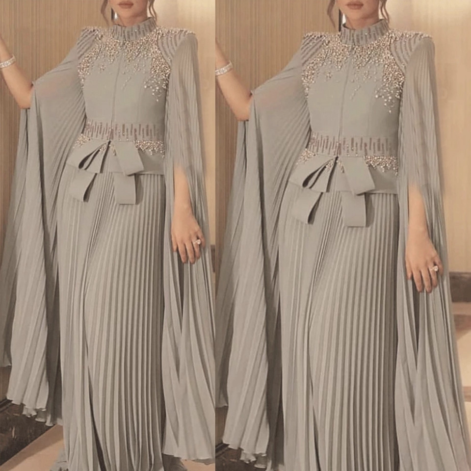 Gray Mother Of The Bride/Groom Dresses 2023 Wedding Party Long Sleeves Chiffon Pleated Beading Formal Party Night Vestido De Festa