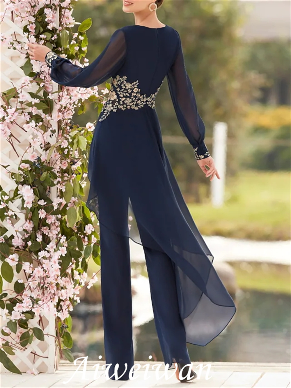 Pantsuit / Jumpsuit Mother of the Bride/Groom Dress Elegant V Neck Floor Length Chiffon Lace Long Sleeve with Appliques