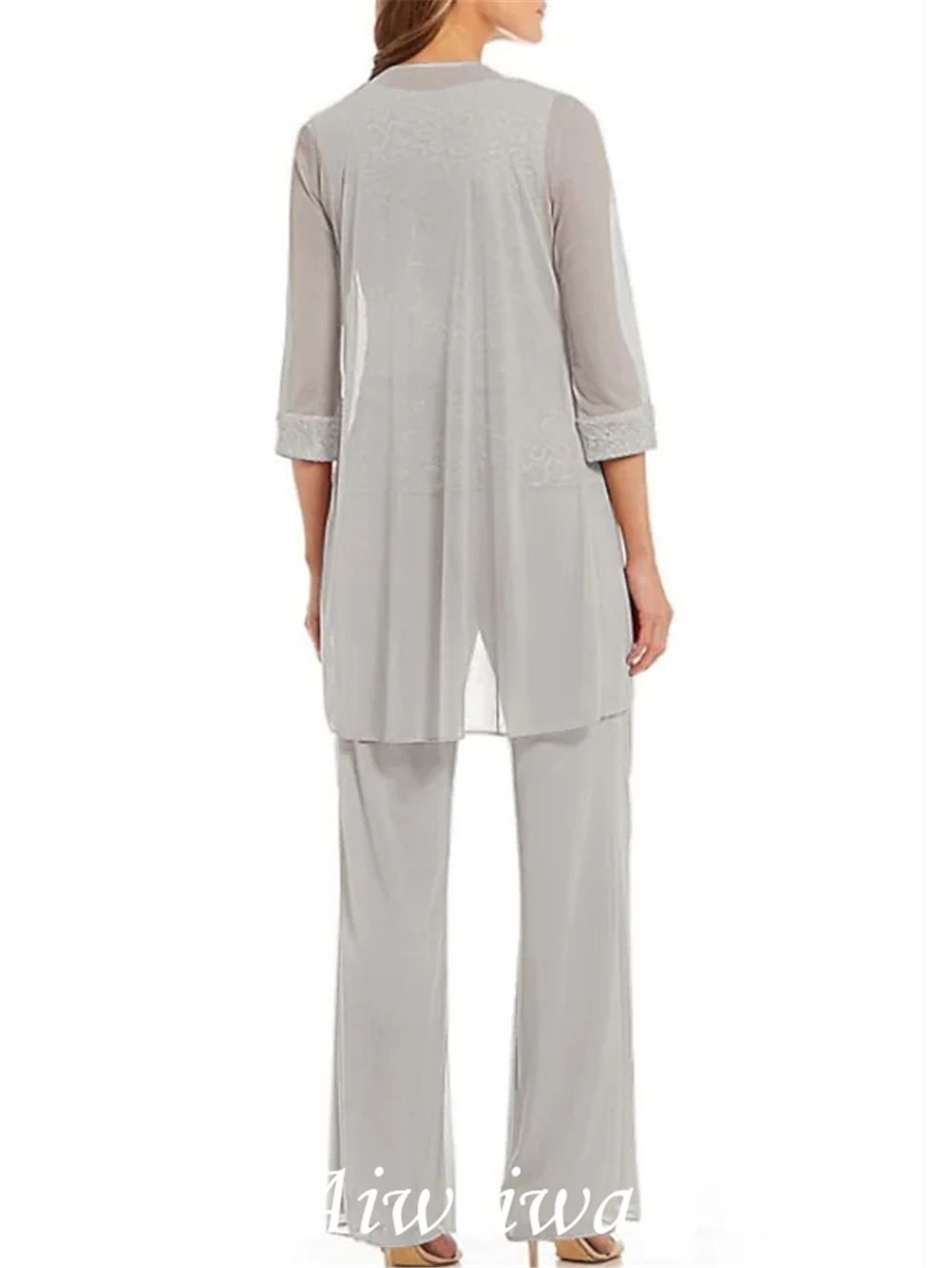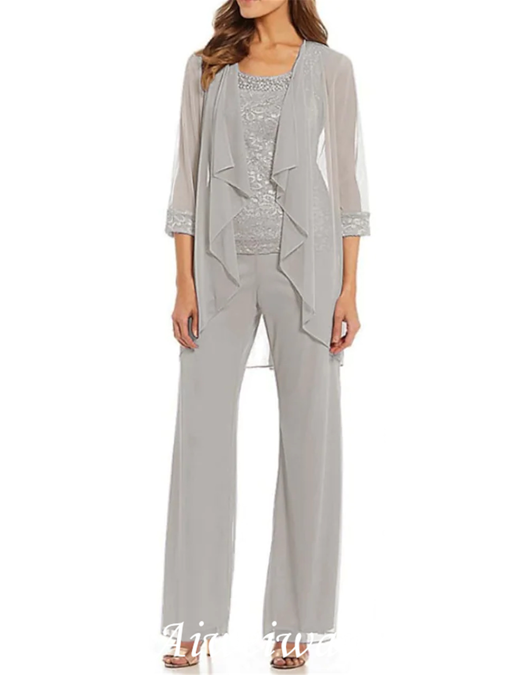 Two Piece Pantsuit Mother of the Bride/Groom Dress Elegant Scoop Neck Floor Length Chiffon Lace Sleeveless with Beading Ruffles