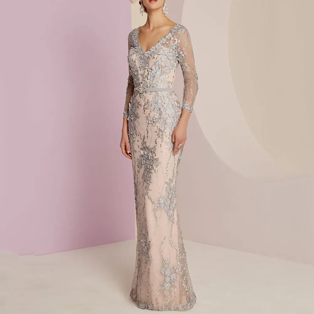 Elegant Three Quarter Mother Of the Bride/Groom Dress Floor Length Lace Appliques V-Neck Gown For Wedding Party Custom Made