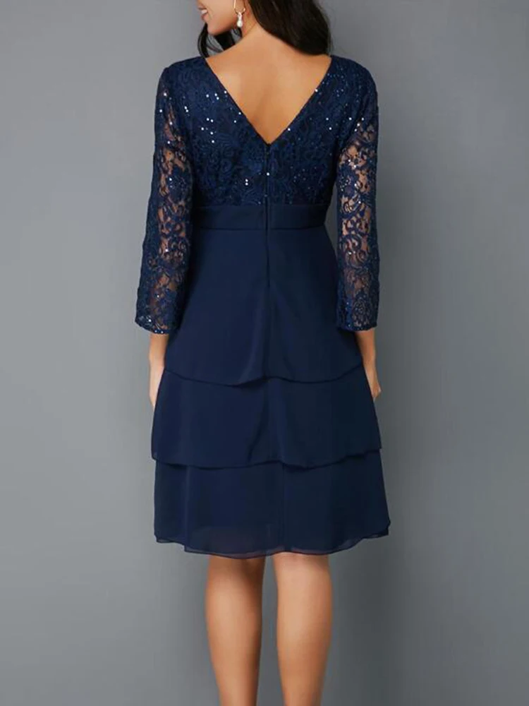 Stunning Navy Blue Short Mother of the Bride Dresses Lace Top With Sleeves V Neck Wedding Party Gowns Tiered Skirt