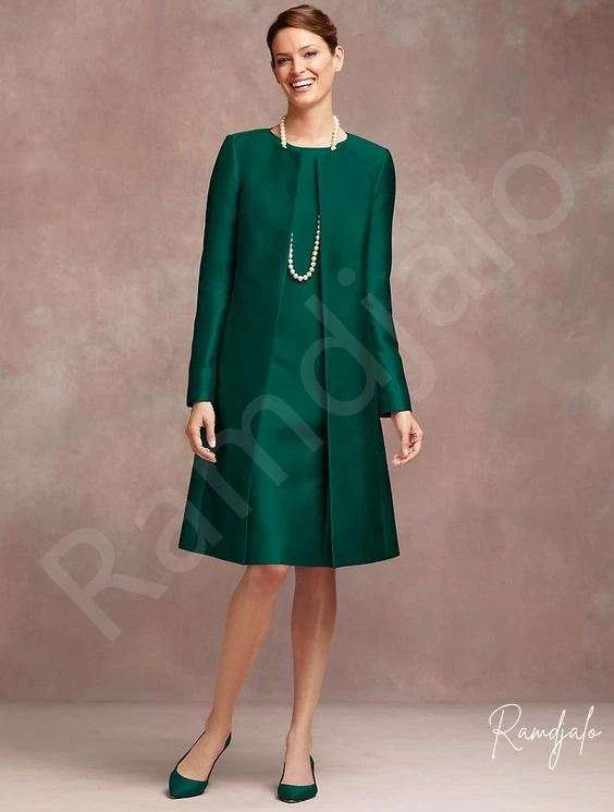 Simple Mother Of The Bride Dresses with Satin Jacket Long Sleeves Knee Length Retro Groom Mother's Wedding Guest Gown