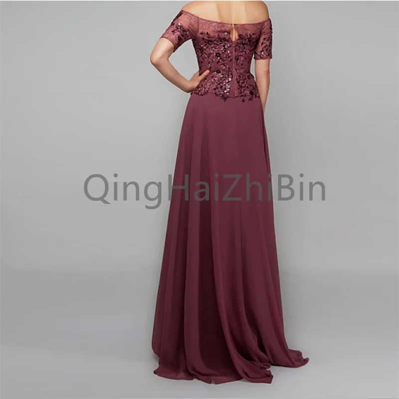 Boat Neck A-Line Short Sleeve Burgundy Mother of the Bride Dresses Sequined Lace Appliques Chiffon Wedding Guest Prom Dress