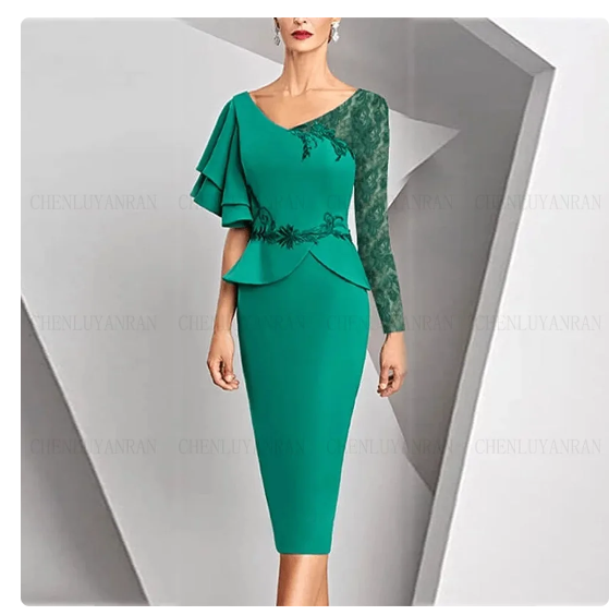 Green Mother Of The Bride /Groom Dresses Sheath V-neck Long Sleeves Jersey Appliques Lace Beading Bride Mother Beautiful Dress