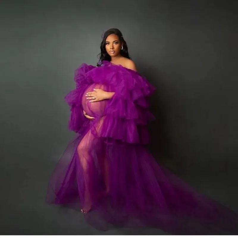 Purple See Through Women Prom Dress Off Shoulder Tulle Ruffles Pregnant Photo Shoot Evening Dresses Plus Size Party Gown Puffy Sleeves