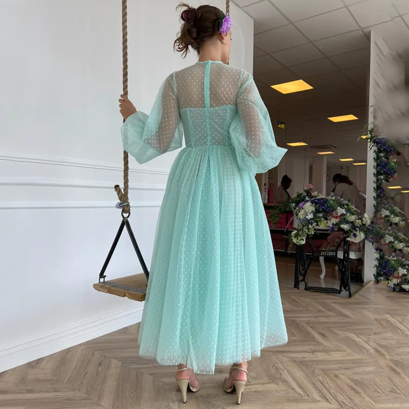 High SHeer Neck Long Sleeve Mint Green Tea Length Buttons Prom Dress A-Line Tulle Evening Gowns
