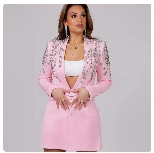 Pink Women Blazer Custom Made Suit Jackets Slim Fit Crystal Beaded Wedding Guest Wear Single Breasted Coat Long Mother's Dress