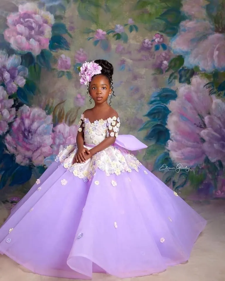 Lilac Sheer Neck Flower Girl Dresses Ball Gown Tulle Short Sleeves Vintage Little Girl Peageant Dress Gowns