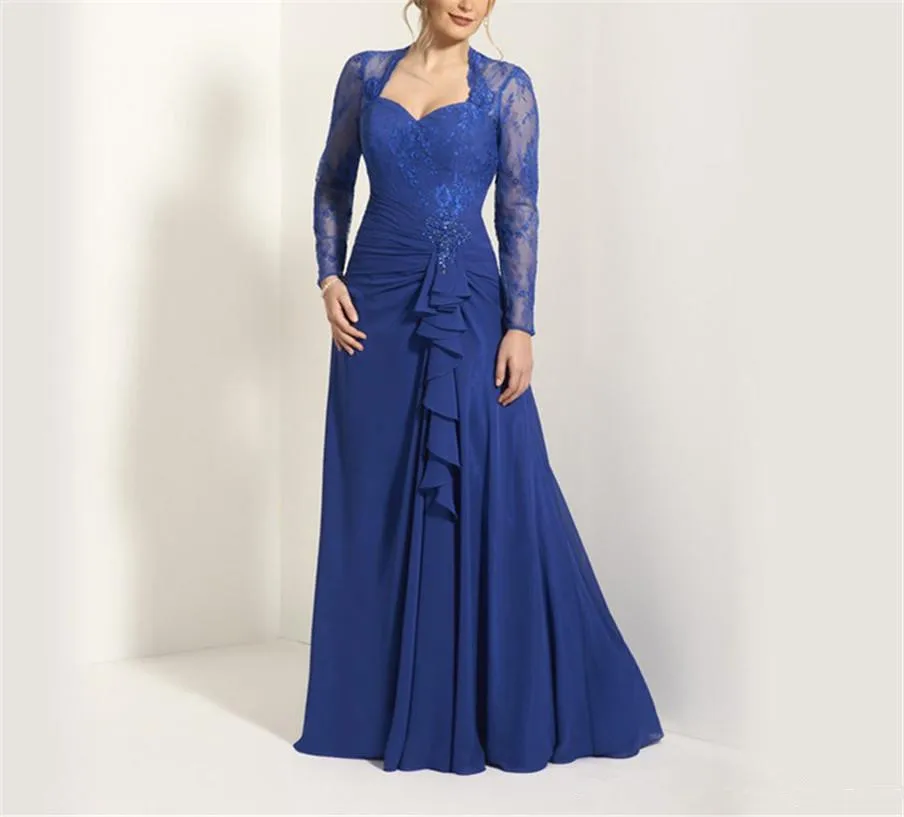 Blue Mother Of The Bride Dresses A-line Long Sleeves Chiffon Lace Plus Size Long Groom Mother Dresses For Wedding