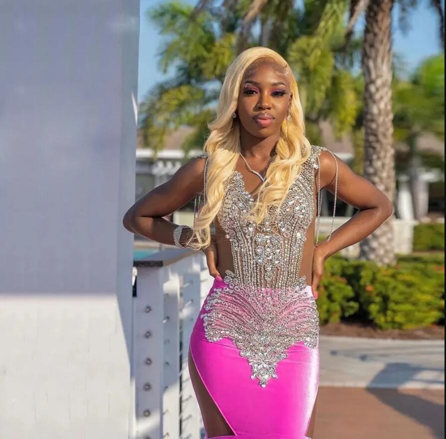 Hot Pink Velvet Mermaid Prom Dresses African Women Glitter Crystals Beads Black Girls Plus Size Evening Occasion Gowns
