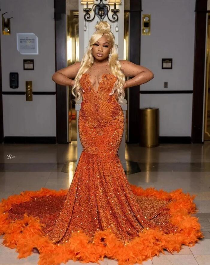 New Arrival Orange Mermaid Prom Dress Sparkly Beads Crystal Feathers Sequins Luxury Evening Dress