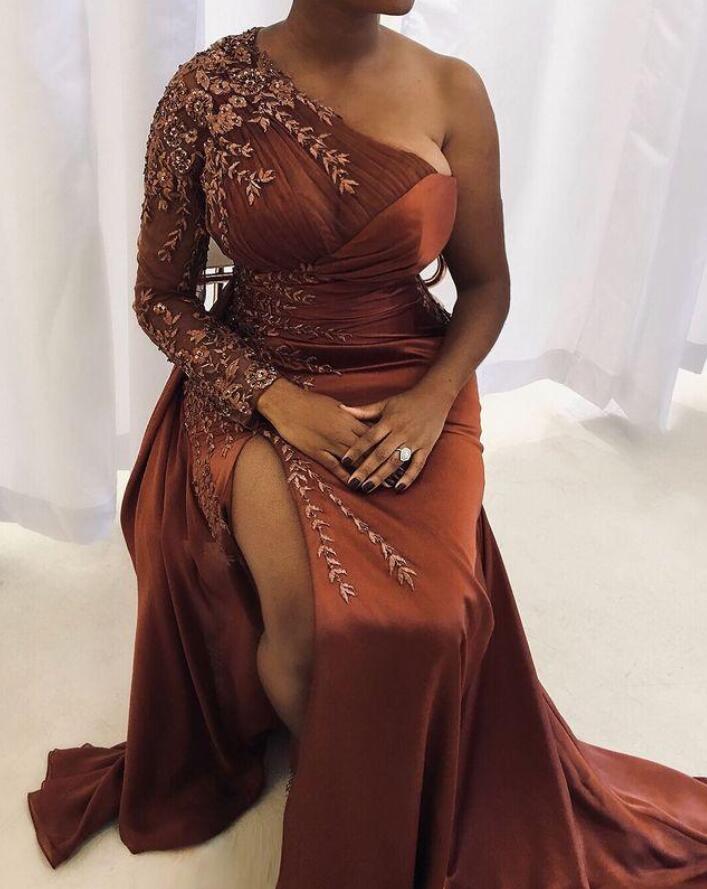 Plus Size One Shoulder Mermaid Prom Dresses Lace Beaded High Split Evening Formal Dress