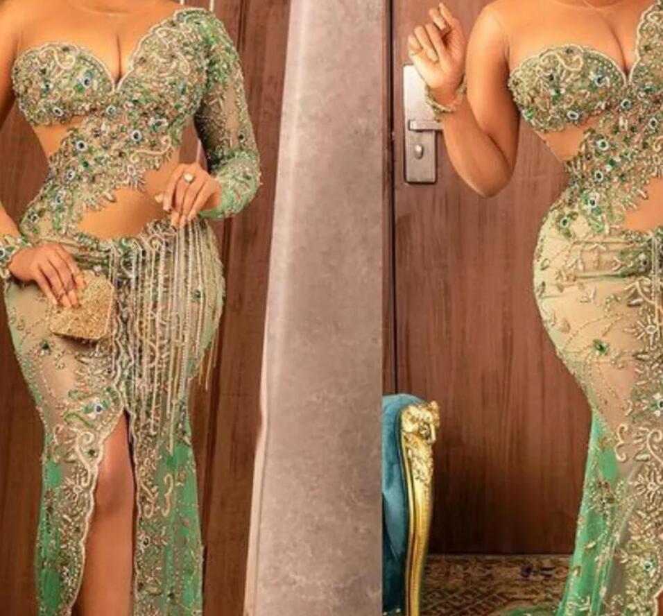 Plus Size Luxurious Beaded Crystals Prom Dresses Lace Sheer Neck Mermaid Evening Formal Party Dress