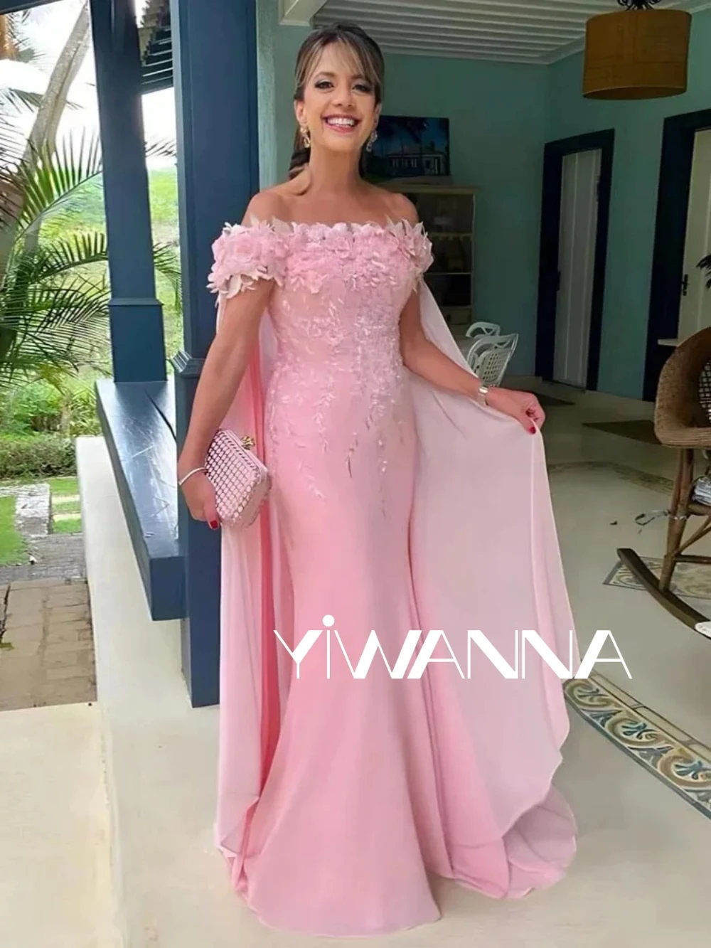 Off The Shoulder Mother Of The Bride/ Groom Dress For Wedding Classic Appliques Prom Dresses Pink Chiffon Long Evening Gown