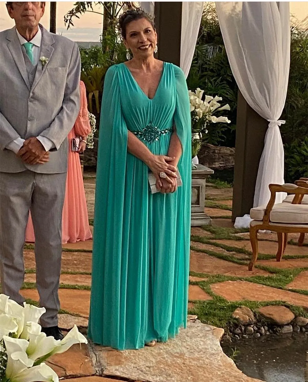 Chiffon Green Beaded Mother of the Bride Dresses With Cape A-Line Pleated Floor Length Mom of The Groom Dress Godmother Dress for Women