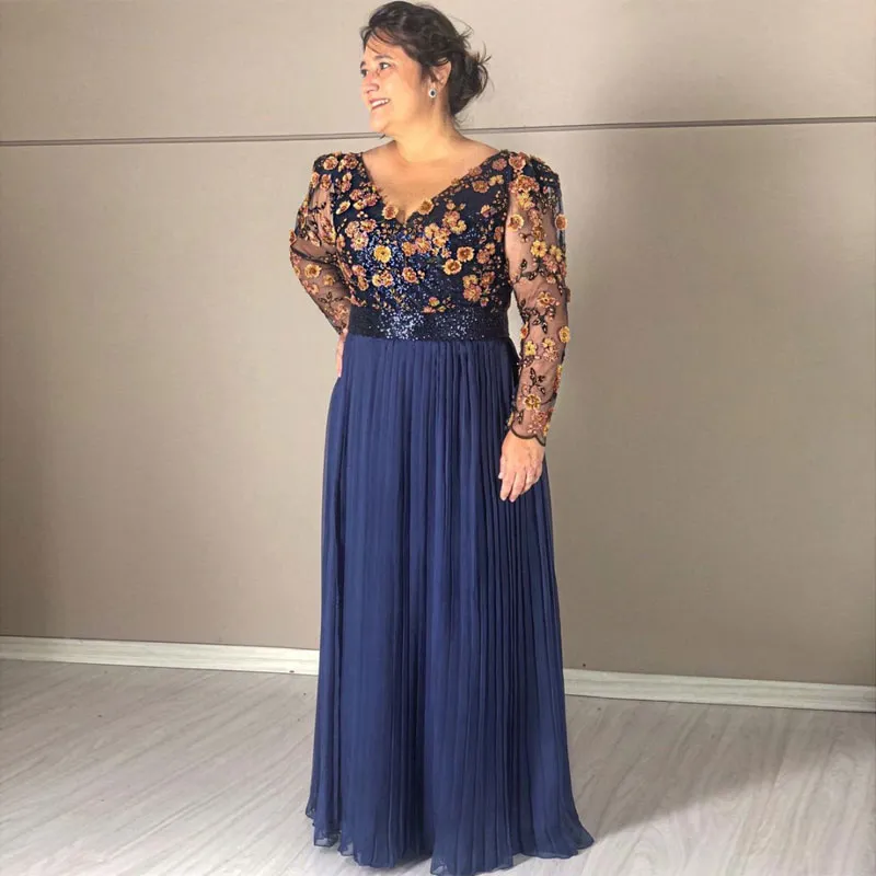 Navy Blue Sequined Mother Of The Bride/Groom Dresses Illusion V Neck Long Sleeves