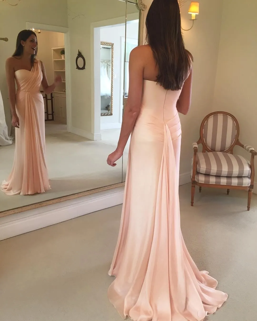 Blush Pink Mermaid Mother Of The Bride/ Groom Dresses Chiffon One Shoulder Pleats Sleeveless Sweep Train Wedding Guest Evening Gowns