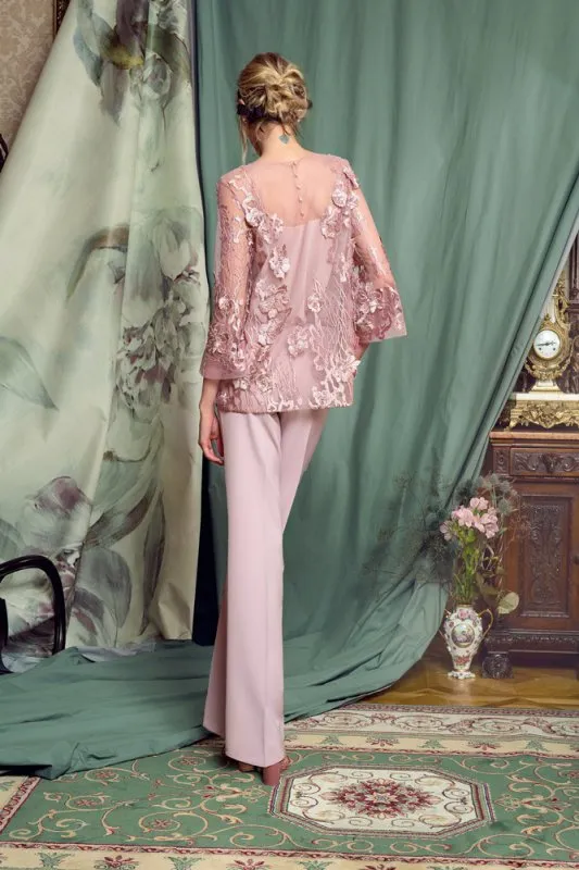 Elegant Pink Pantsuits Mother Of The Bride Dresses Jewel Neck Long Sleeves Lace Prom Dress Chiffon Pants Formal Wedding Guest Gowns