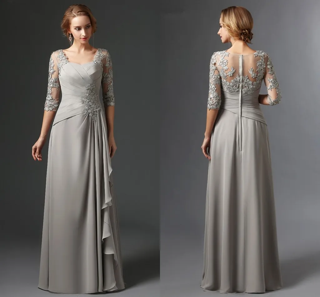 Silver Mother Of The Bride Dresses A-line Half Sleeves Chiffon Lace Plus Size Long Elegant Groom Wedding Party Gown