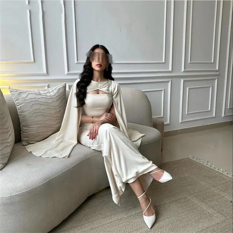 Pleat O-neck Sheath Mother Of The Bride/ Groom Dress Champagne Satin Ankle Lenght With Cape Sleeves Evening Party Gowns