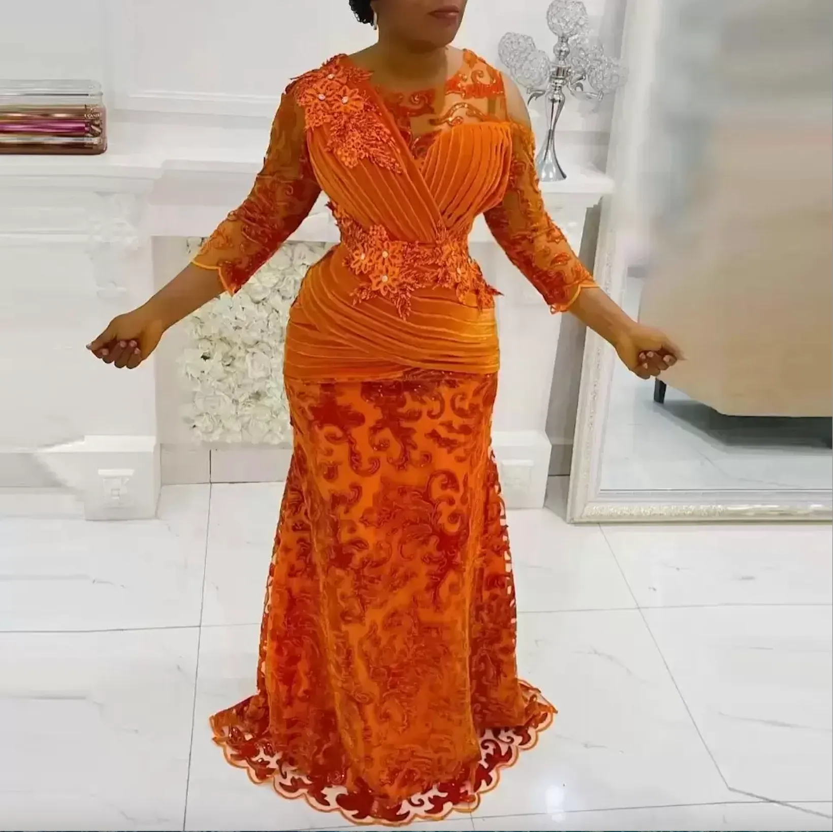 Orange 3/4 African Long Sleeves Evening Dresses with Lace Appliques Sheer Neckline Mermaid Prom Dress Aso Ebi Mother of the Bride Gowns