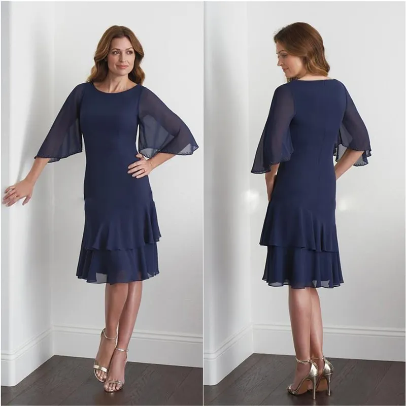 Navy Blue Mother Of The Bride/Groom Dress With Sleeves Knee Length Chiffon Elegant Wedding Party Guest Wear O Neck Formal Gowns