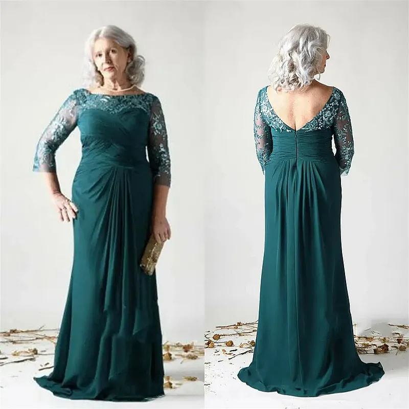 Dark Green Long Mother Of The Bride/Groom Dresses Lace Appliques Ruched Chiffon A Line Plus Size Wedding Guest Dress
