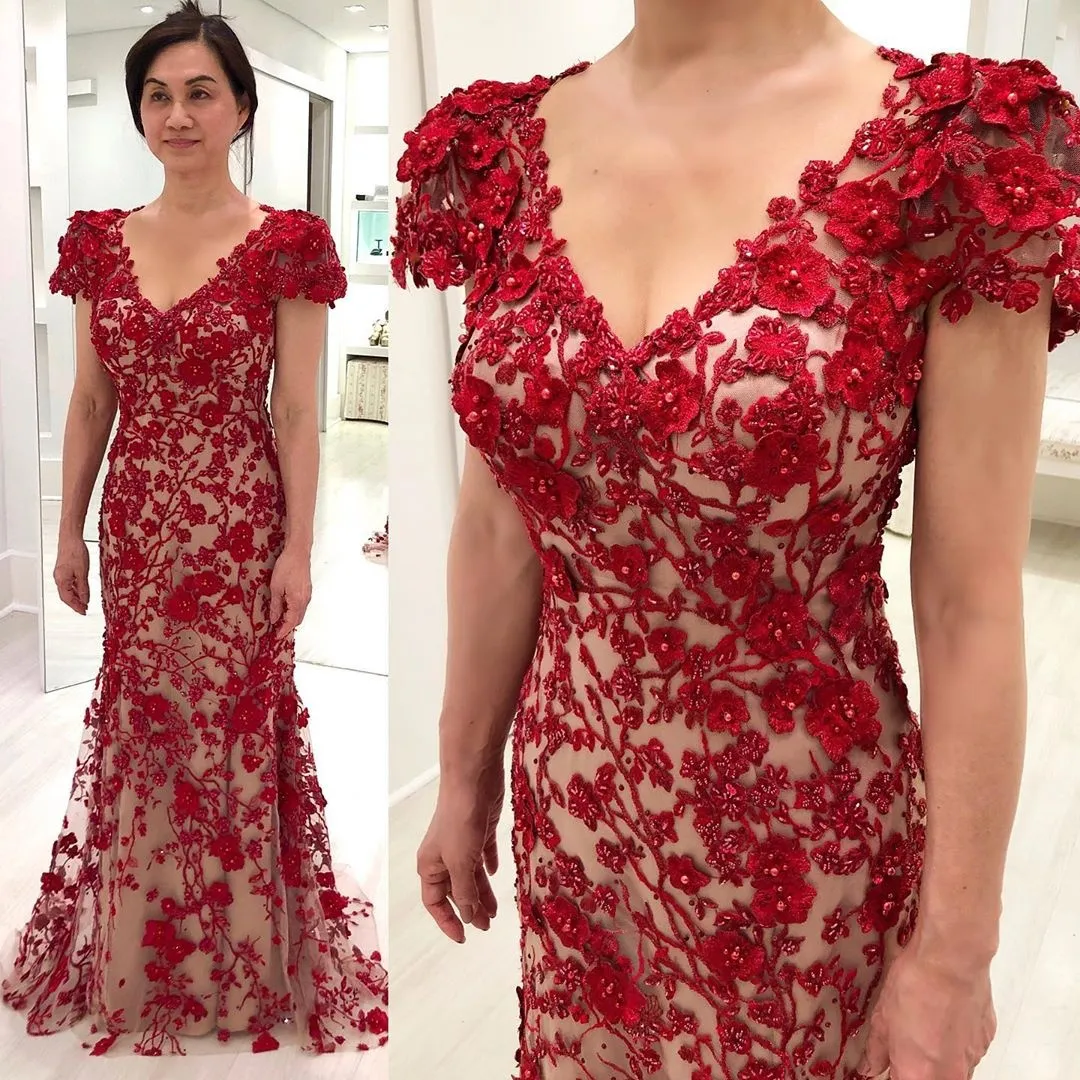 Classy Mermaid Beaded Mother Of The Bride / Groom Dresses V Neck Evening Gowns Floor Length Plus Size 3D Appliqued Wedding Guest Dress