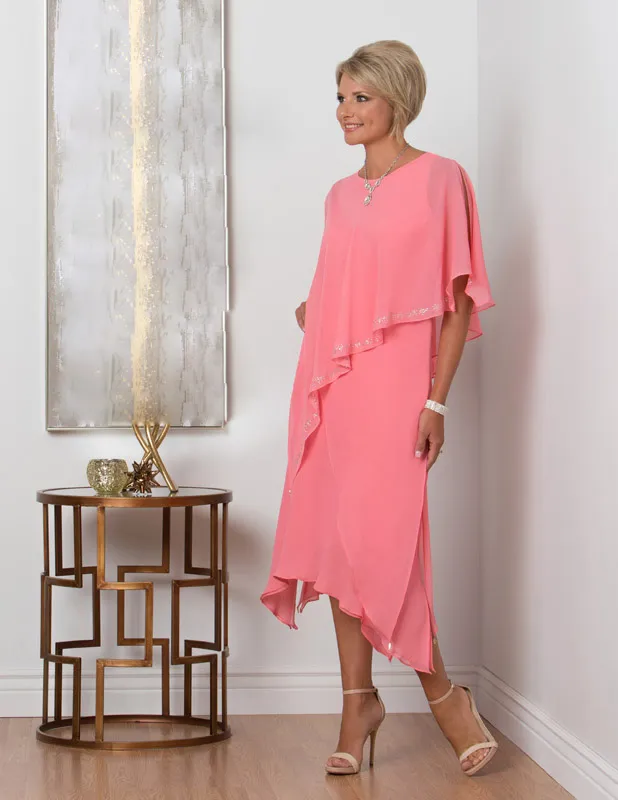 Tea Length Mother Bride/ Groom Dresses Sleeves Cascading Ruffles Jewel Neck A Line Plus Mothers Dress