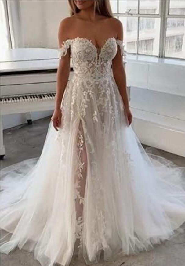 Elegant A Line Off the Shoulder Lace Appliques Wedding Dress Bridal Gown
