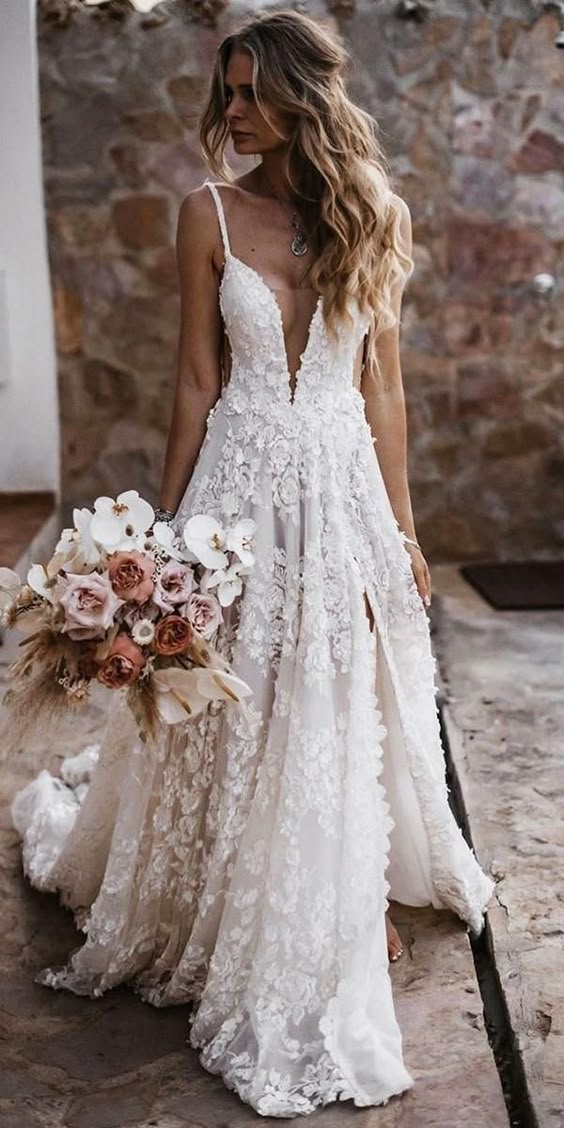 Elegant V Neck Sleeveless Lace Appliques Side Slit Wedding Dress Bridal Gown