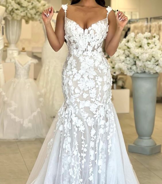 Elegant Mermaid Lace Appliques Tulle Wedding Dress Bridal Gown
